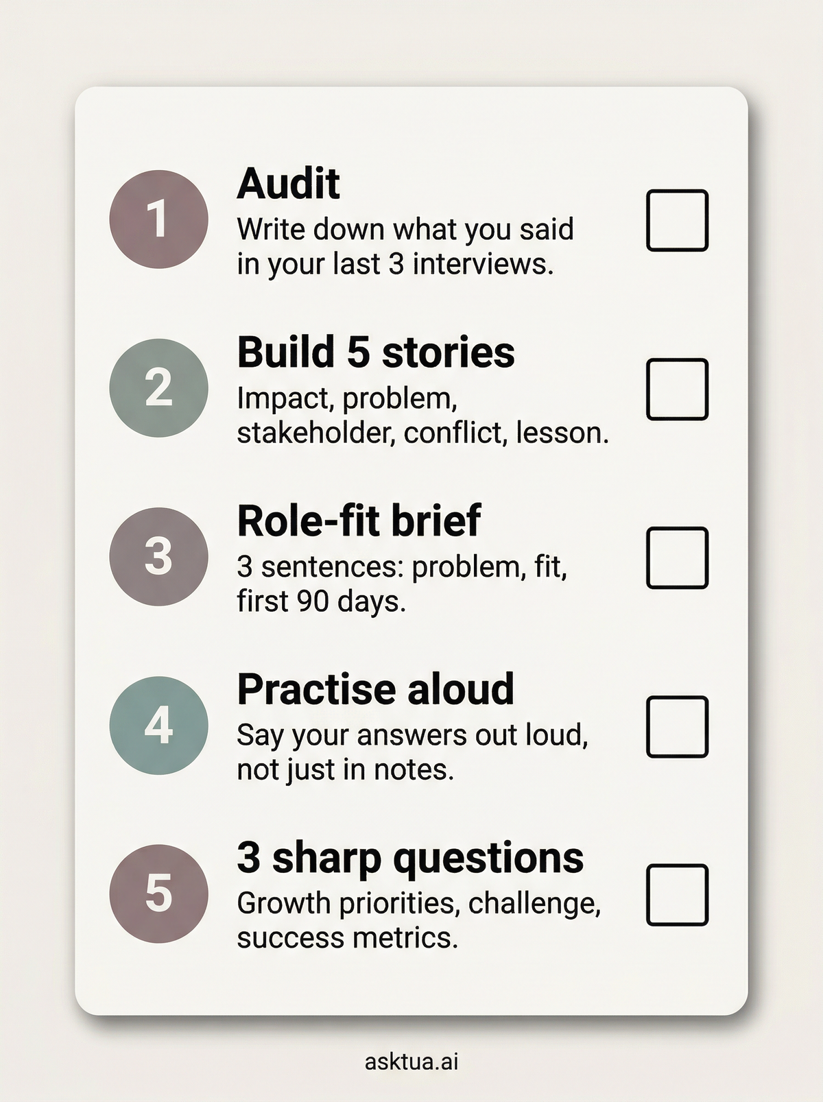 Audit your last few interviews for patterns, then build five core stories you can adapt to most questions. Practise them aloud, not just in notes, and make sure each one has a clear beginning, middle, and finish.